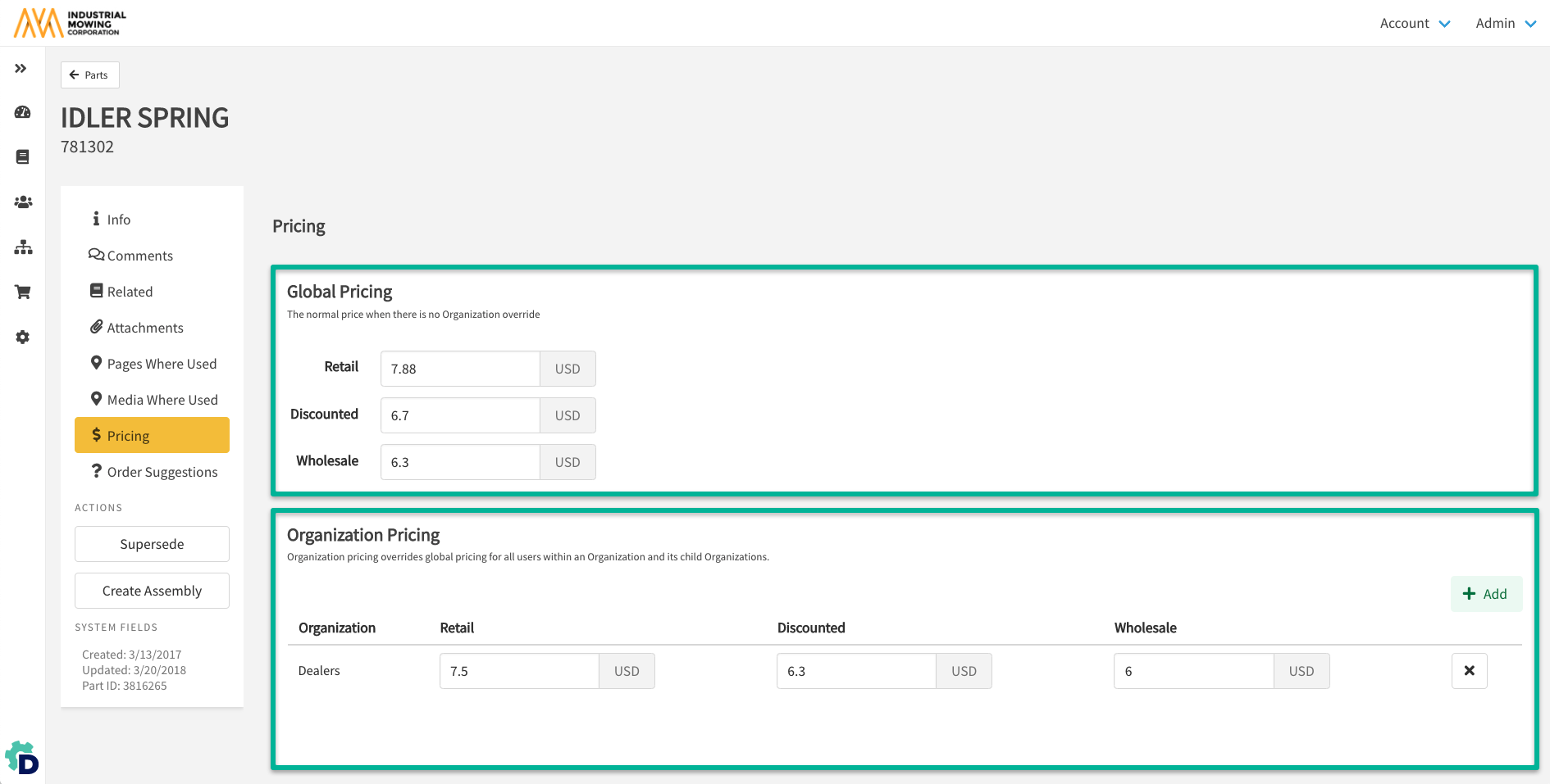 Customers who need to manage singular or multiple pricing tiers or different currencies can do so by leveraging global and/or organization-specific pricing for their parts.