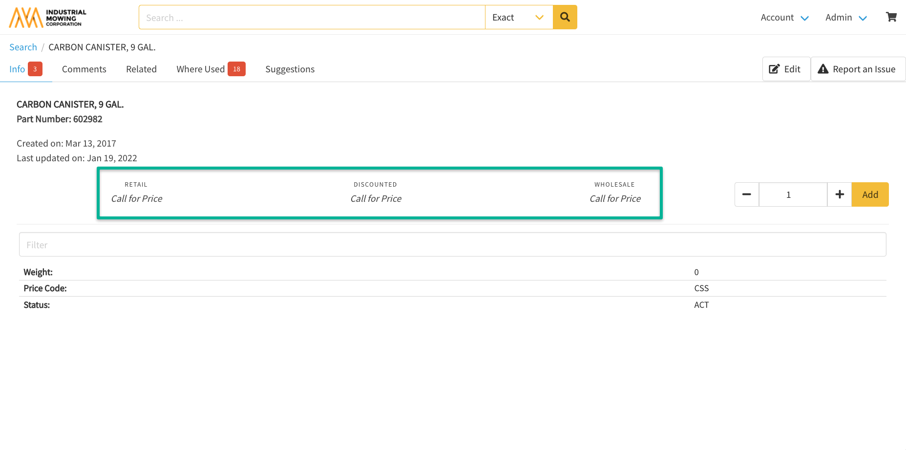 - If pricing is enabled but pricing has not been applied to a part, Documoto will display default text that says Call for Price. This text can be customized using Labels.