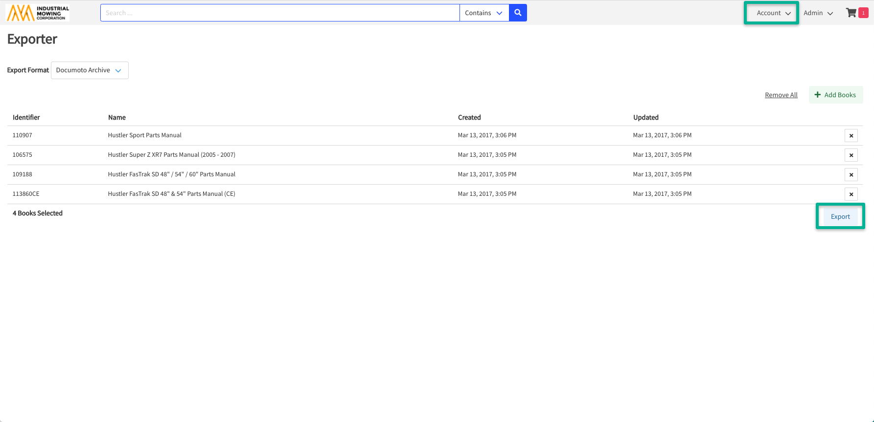 - Check the export job status and download your exported books from the Account drop-down > Job Manager.