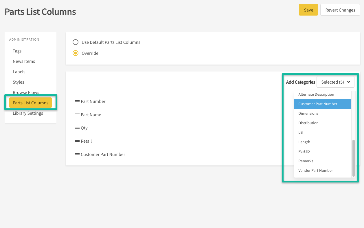 To show the Part Tag and Tag Value in the Parts List Columns of the Documoto BOM go to Library > Parts List Columns.