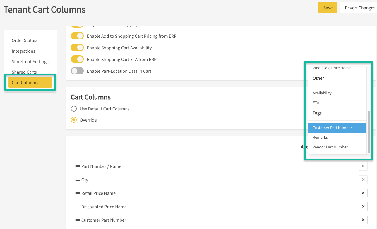 To show Part Tag and Tag Value in your Cart Columns go to Storefront Admin > Cart Columns.