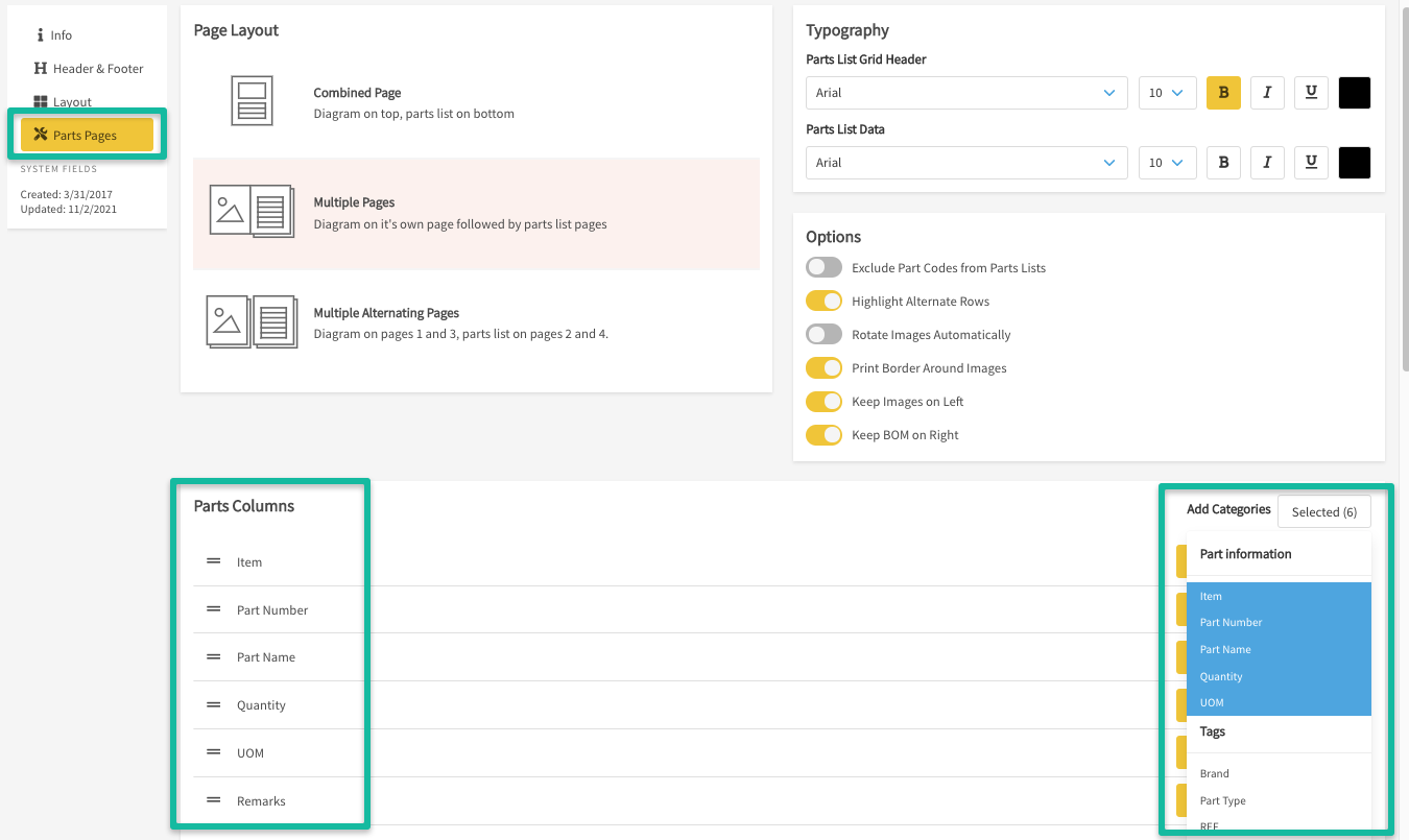 Enabling the Display tags in parts list property allows for the tag to become an additional option when configuring Parts List Columns in both the online and printed bill of materials (BOM) within Documoto.