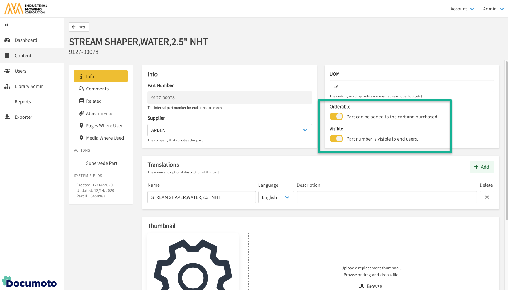 - Within Documoto, go to Admin Center > Content > Parts.