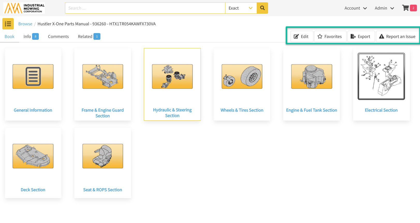 In the Documoto Library, content is displayed in viewers and is where users interact with content that they have opened, as well as see additional information related to that content, including: tags, comments and related media. Users with the appropriate privileges are also able to export content, favorite content and report content issues from viewers.
