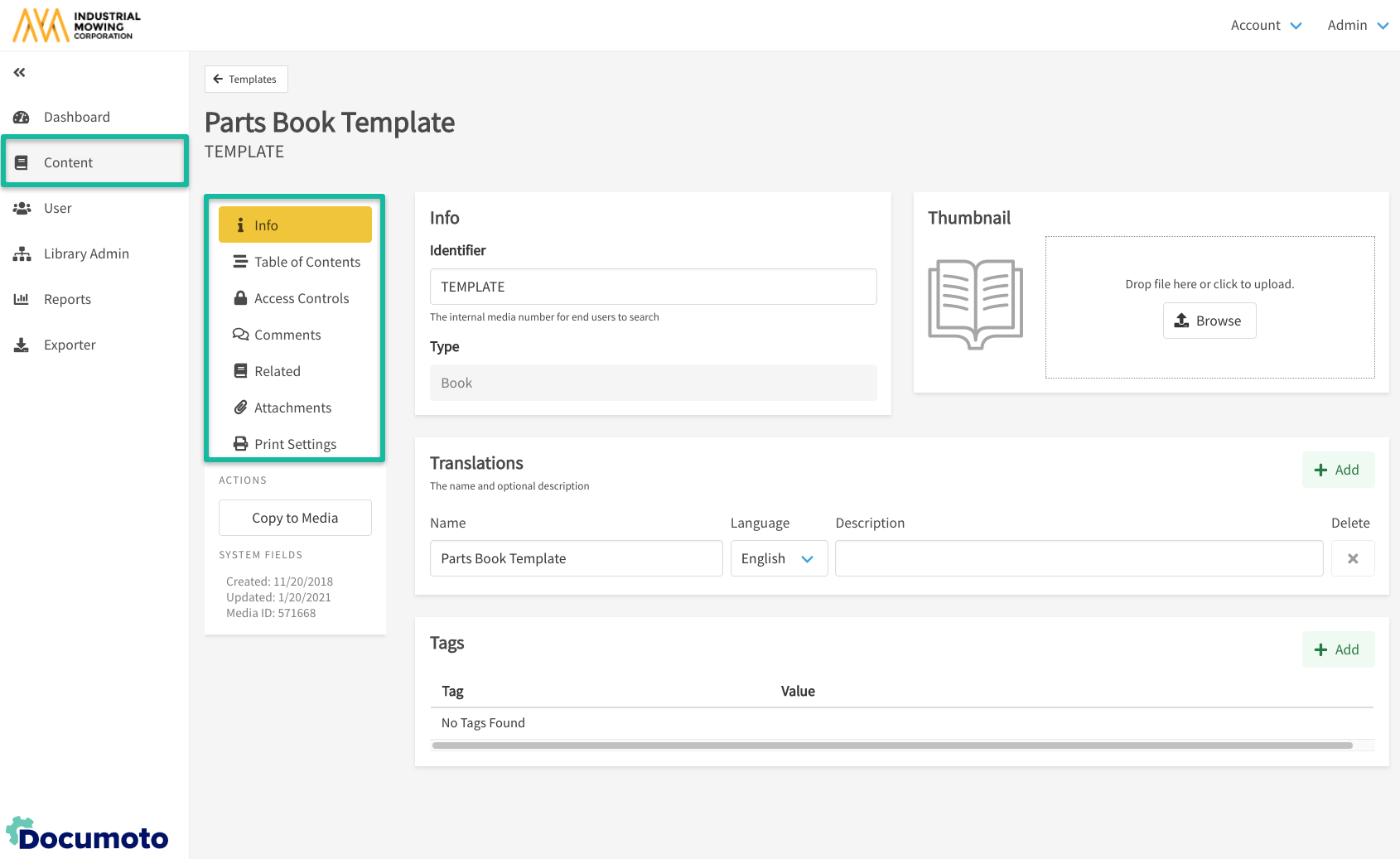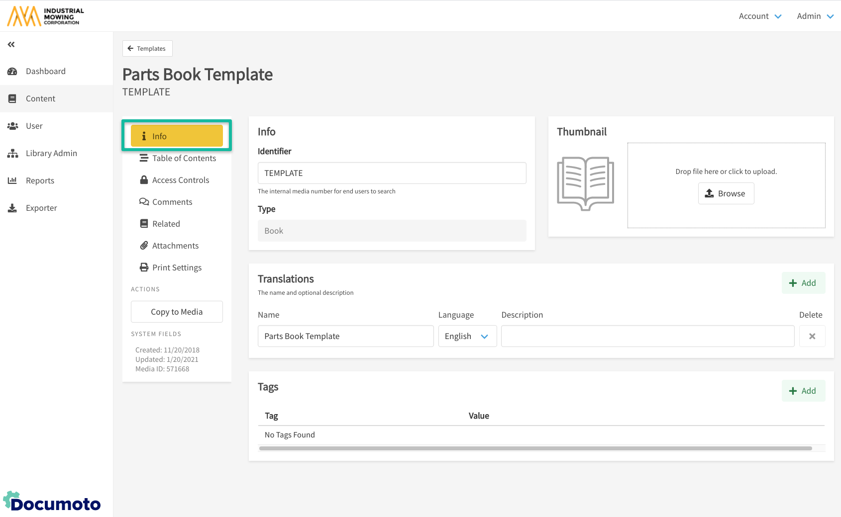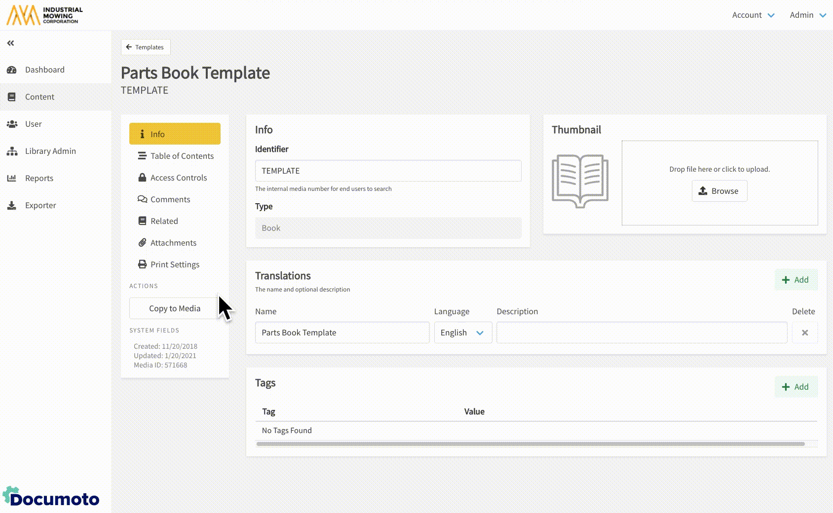 - Within Documoto, go to Admin Center > Content > Templates > select a desired template.