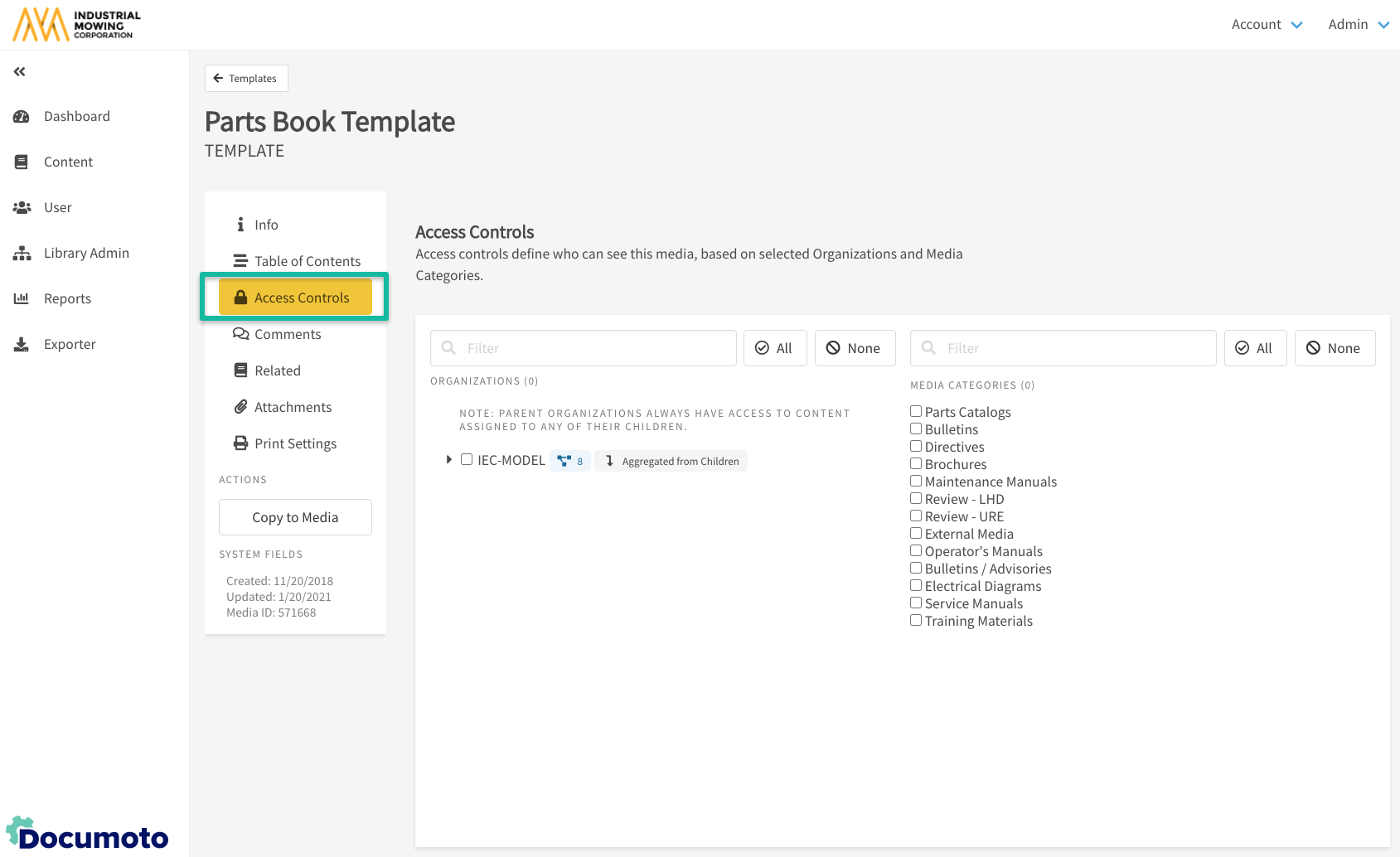 For a template to be viewable in the Library, it must have at least one Organization and one Media Category assigned in its Access Control settings.