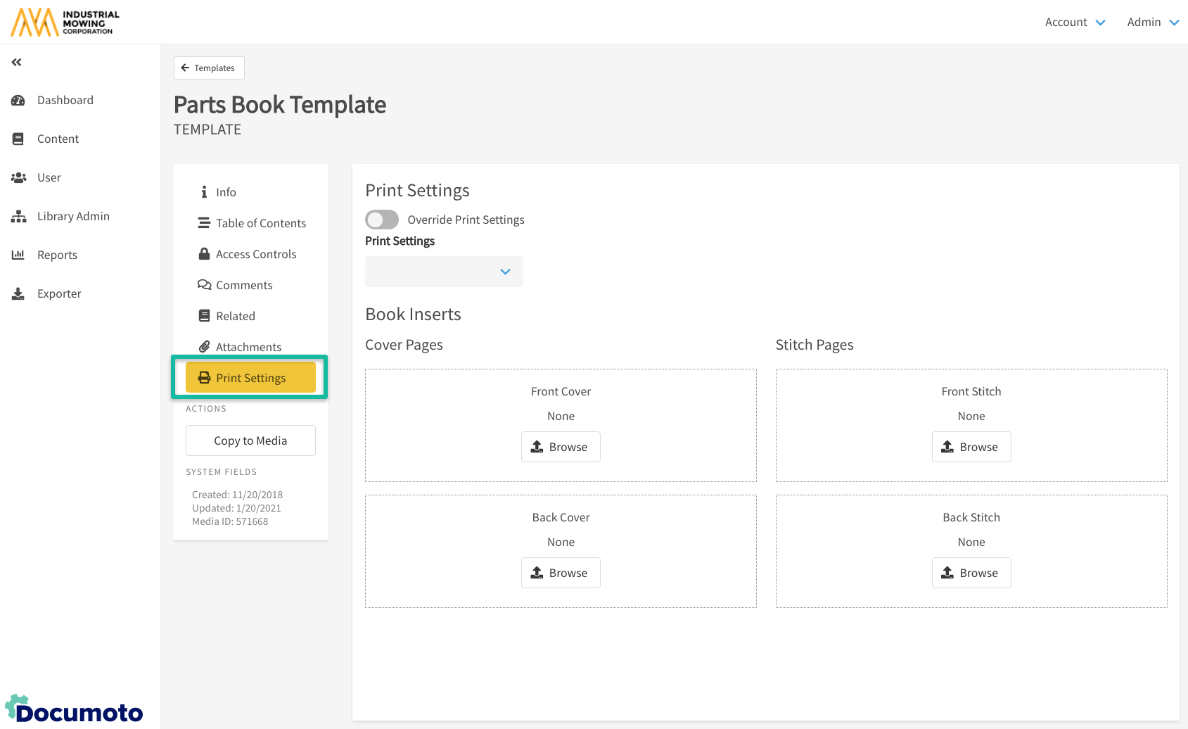 Print Settings allows publishers to customize the Print Settings template for an individual media item, as well as customize the cover and stitch pages.